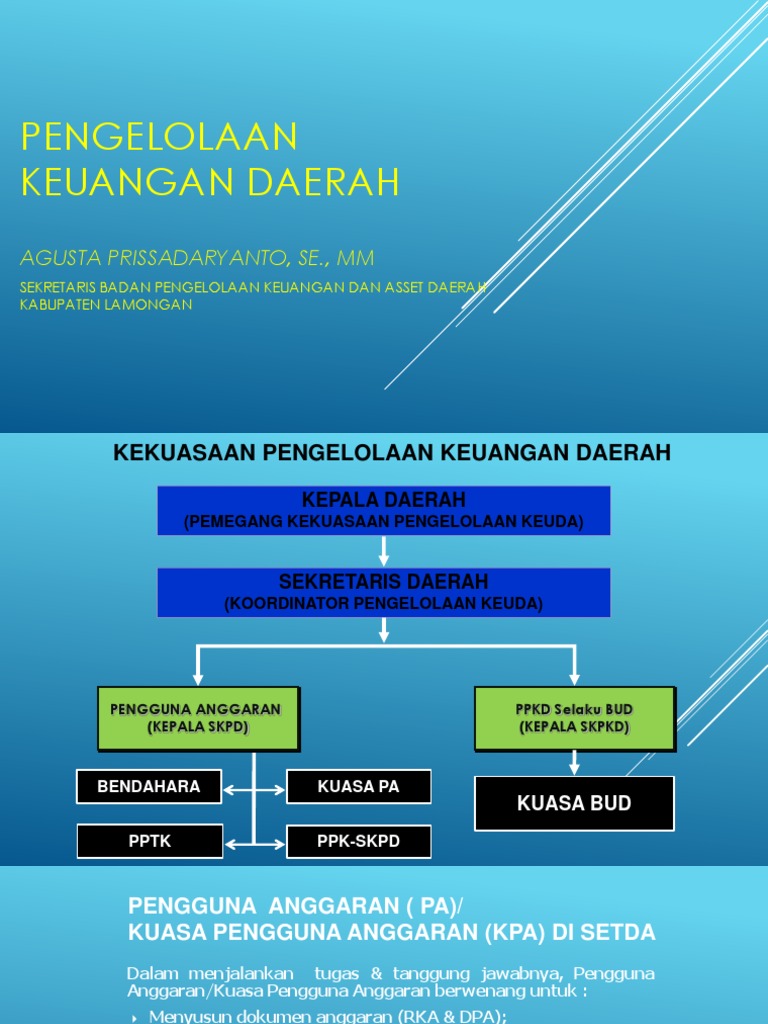 Kebijakan mekanisme pengelolaan keuangan daerah dan hibah dak fisik penugasan bidang pertanian ta 2020. Pengelolaan keuangan daerah adalah keseluruhan kegiatan yang meliputi perencanaan, pelaksanaan, penatausahaan, pelaporan, pertanggungjawaban, dan pengawasan keuangan daerah. Penatausahaan keuangan daerah merupakan bagian yang tak terpisahkan dari proses pengelolaan keuangan daerah, baik menurut peraturan pemerintah nomor 58 tahun 2005 maupun berdasarkan permendagri nomor 13 tahun 2006 tentang pedoman pengelolaan keuangan daerah.