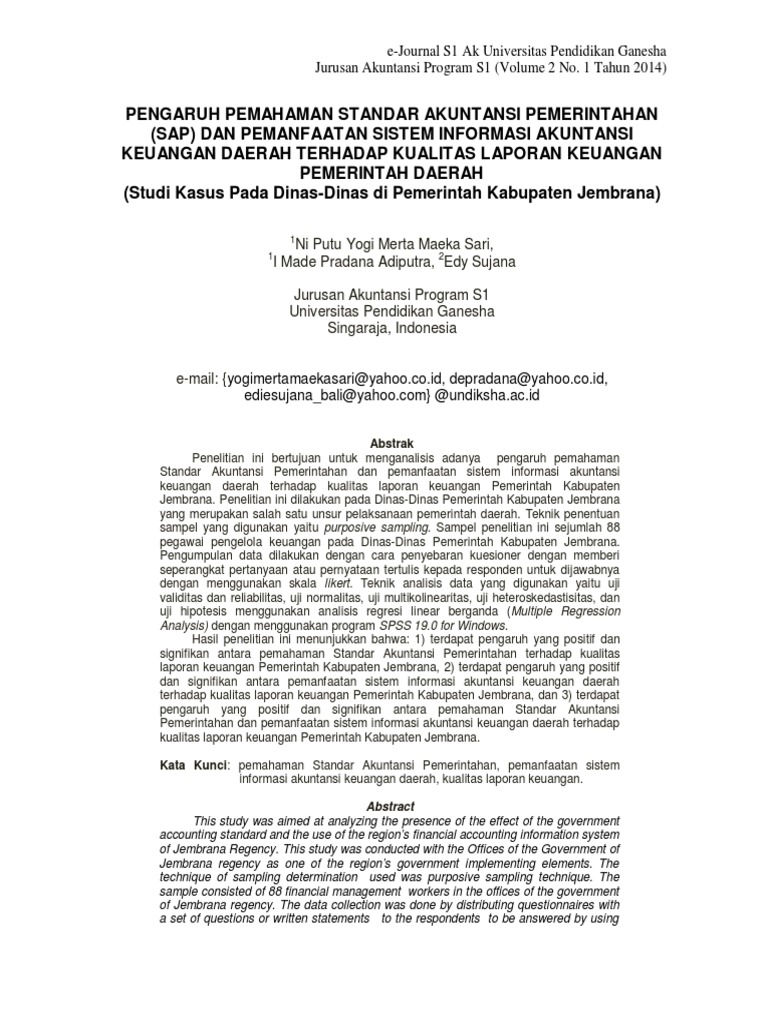 Teknik sampling yang digunakan adalah nonprobability sampling dengan memakai. Abstrak penelitian ini bertujuan untuk mengetahui pengaruh penerapan sistem informasi akuntansi terhadap kualitas laporan keuangan pada pt. Pengaruh penerapan sistem informasi manajemen keuangan daerah (simda) terhadap kualitas laporan keuangan pada pemerintah kabupaten karo oleh :