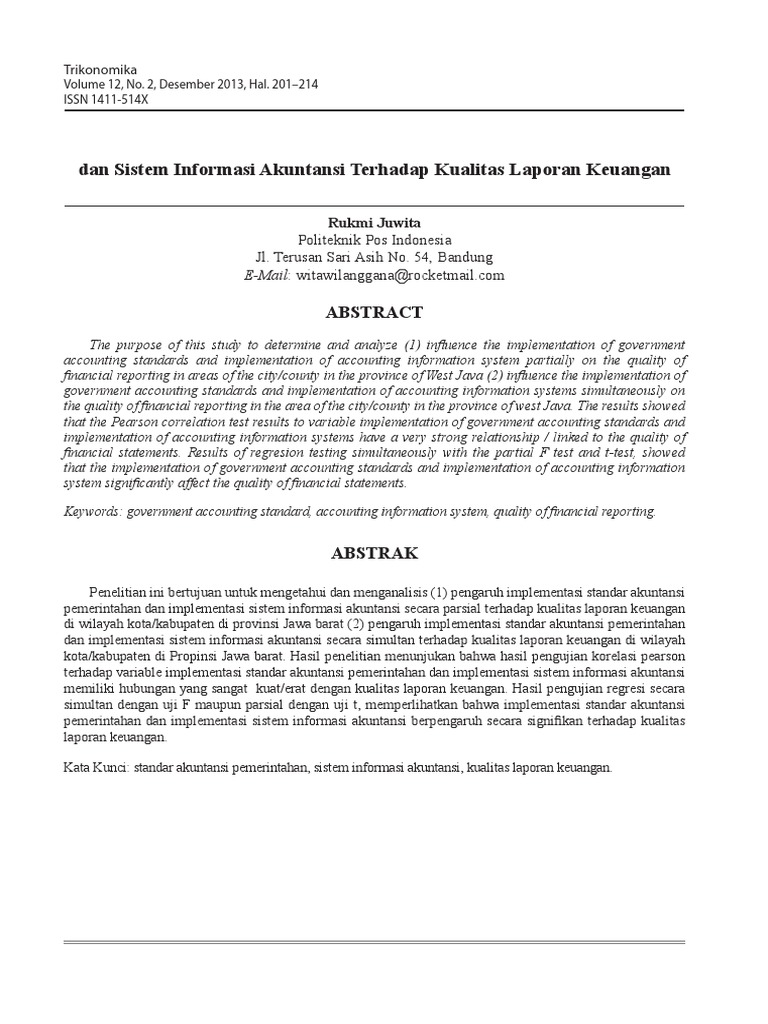 Simanjuntak1 torangpartogi@gmail.com 1 dosen tetap fakultas ekonomi universitas darma agung abstrak penelitian ini bertujuan untuk mengetahui pengaruh penerapan sistem informasi (2014).pengaruh penerapan sistem akuntansi keuangan daerah terhadap kualitas informasi laporan keuangan dengan sistem pengendalian intern sebagai variabel intervening(studi empiris pada skpd kota solok). Rio gusherinsya1, samukri2 1stie muhammadiyah jakarta, rio2308gus@gmail.com.