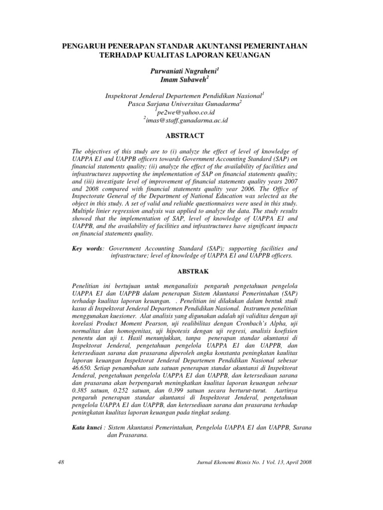 Garuh penerapan sistem akuntansi keuangan pemerintah daerah terhadap kualitas laporan keuangan pemerintah daerah (studi kasus pada dinas bina marga provinsi jawa barat) skripsi. Pengaruh kompetensi sumber daya manusia dan penerapan sistem akuntansi keuangan daerah terhadap kualitas laporan keuangan daerah pada satuan kerja perangkat daerah (skpd) kabupaten empat lawang sumatera selatan. Akuntansi keuangan berpengaruh terhadap kualitas laporan keuangan.