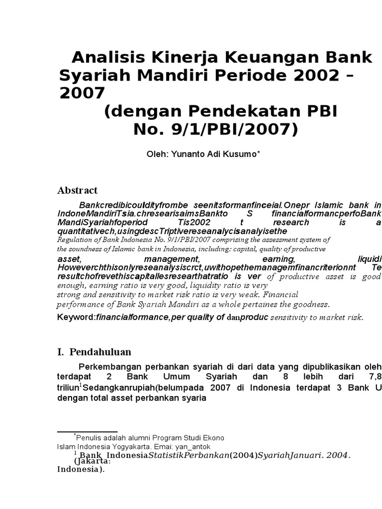 Analisis kinerja keuangan pada bank syariah mandiri di jakarta skripsidisusun untuk memenuhi syarat guna memperoleh gelar sarjana ekonomi jurusan manajemen pada fakultas ekonomi universitas muhammadiyah surakarta oleh : Mengetahui kinerja keuangan bank umum syariah di indonesia berdasarkan islamicity performance index pada tahun 2017. Pengaruh kinerja keuangan memengaruhi roa bank syariah.