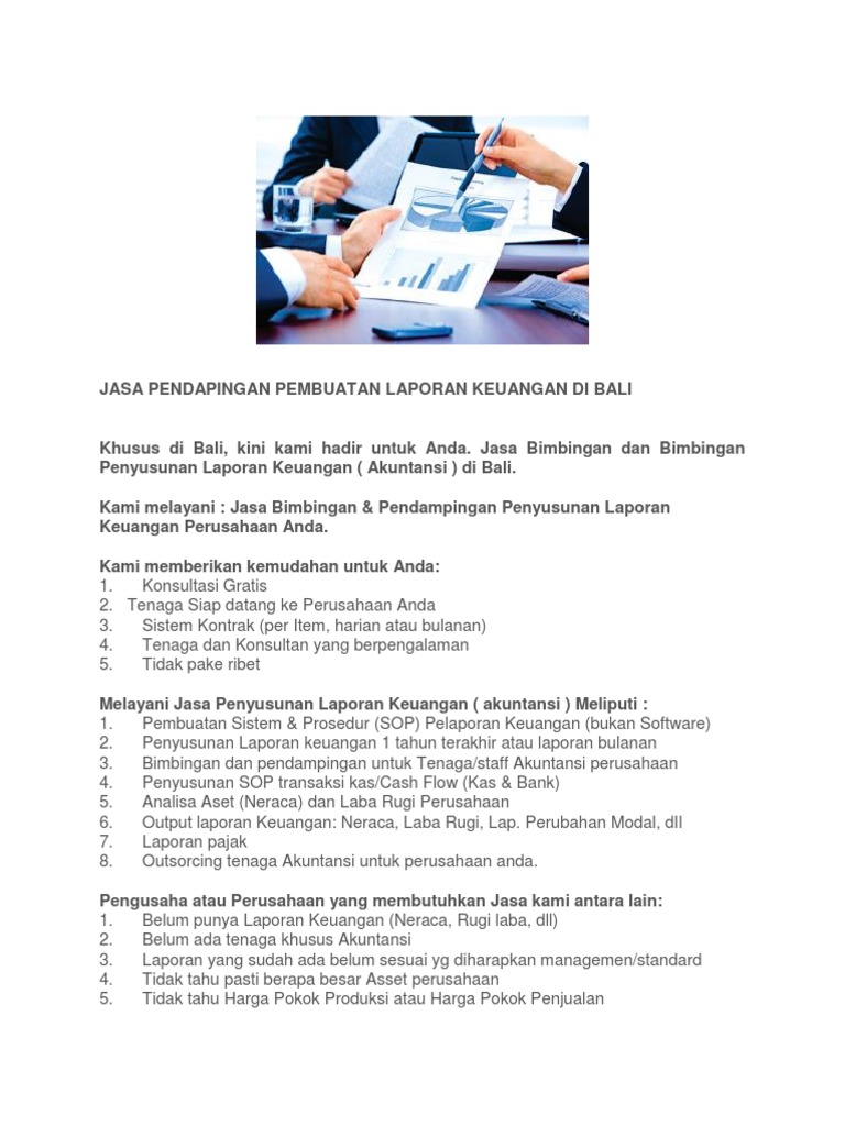 Jasa pembuatan laporan keuangan. Baru rp 700.000 laporan keuangan merupakan informasi penting untuk melihat perkembangan usaha, memelihara harta, dasar pijakan untuk membuat keputusan bisnis bagi kemajuan perusahaan di masa yang akan datang dan berbagai kegunaan lainnya. Fungsi laporan perubahan modal perusahaan jasa yang paling utama adalah untuk menggambarkan peningkatan atau penurunan aset netto atau kekayaan bersih selama periode pelaporan. Laporan keuangan adalah informasi yang menyajikan laporan posisi keuangan, laba rugi, perubahan ekuitas, dan cash flow perusahaan pada waktu tertentu.